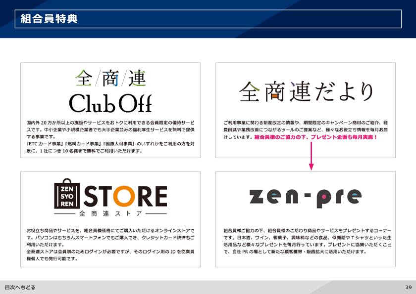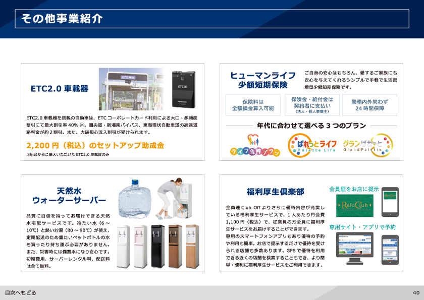 全商連加盟組合で取り扱っている法人向けのETC カード「ETC コーポレートカード」と「全商連ETC カード」、燃料(ガソリン)カードを中心に、高速道路の割引制度やガソリンの給油価格設定に関する詳細を分かり易くご案内しています。この他、共同購買事業や情報サービスのご紹介など、組合に加入することでご利用いただけるお役立ち事業をご紹介しています。