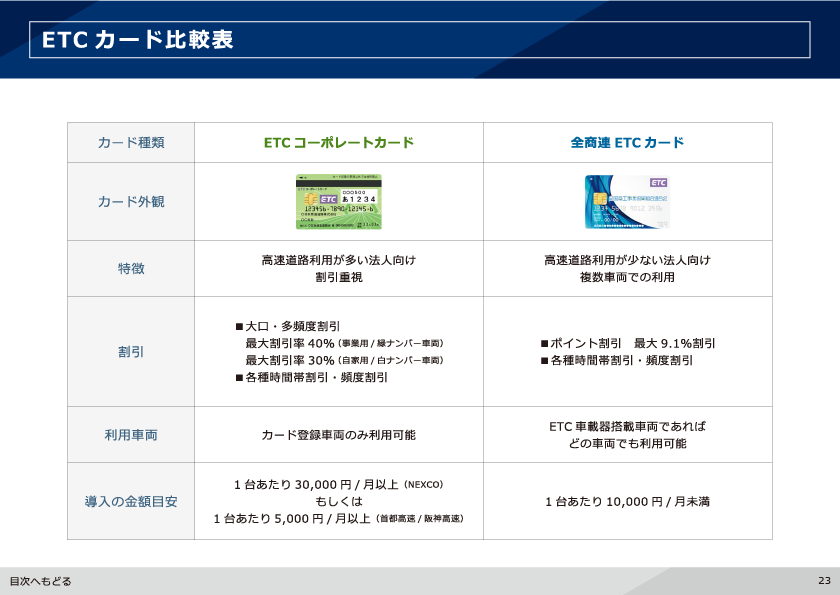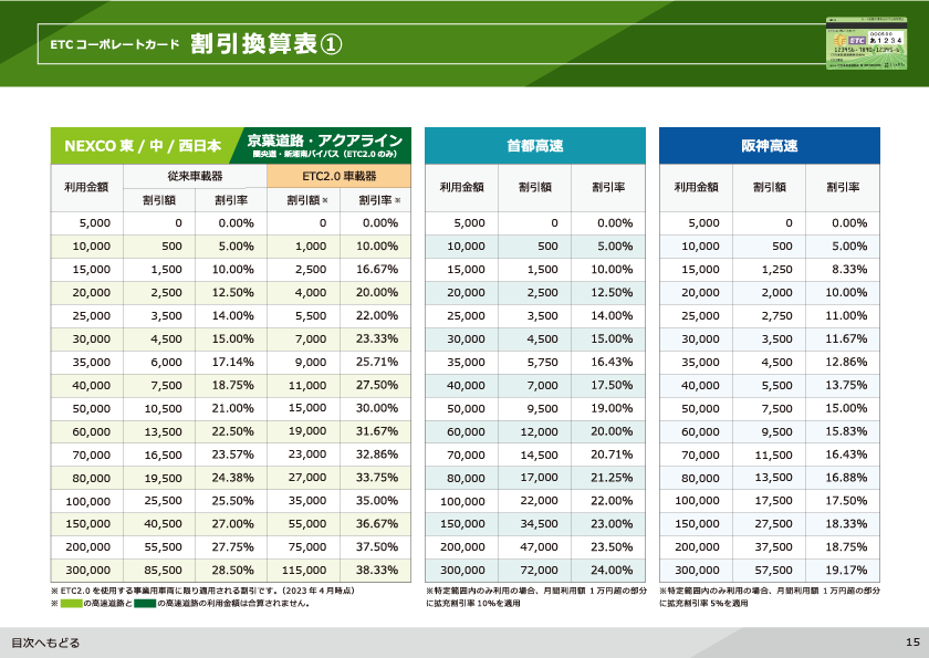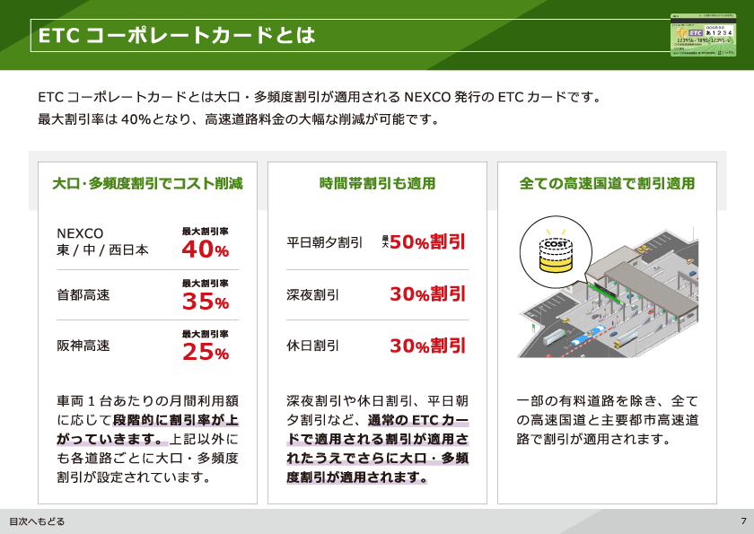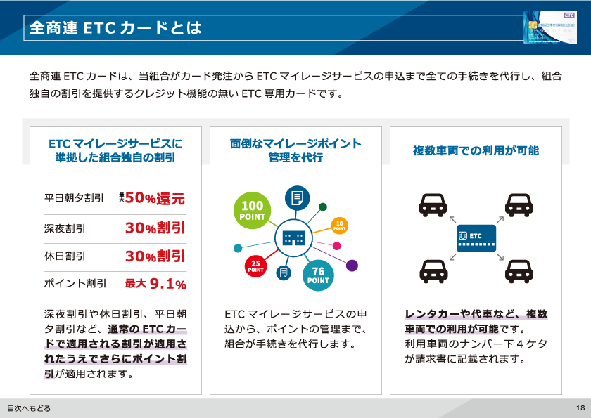 全商連加盟組合で取り扱っている法人向けのETC カード「ETC コーポレートカード」と「全商連ETC カード」の特徴や違いを中心にご案内しています。それぞれに適用される割引制度の説明や、高速道路会社別の割引額・付与ポイント率、割引額の目安となる早見表などを分かり易くご覧いただけます。割引以外のご利用メリットやETC カード別の発行条件もご案内しています。ETC コーポレートカードと全商連ETC カードの比較表も記載しておりますので、ETC カードの発行をご検討中の方はぜひご覧ください。