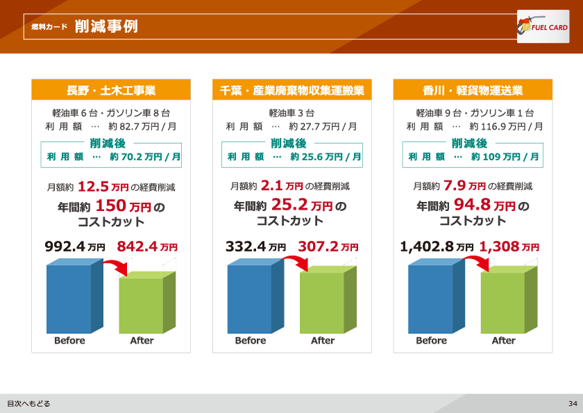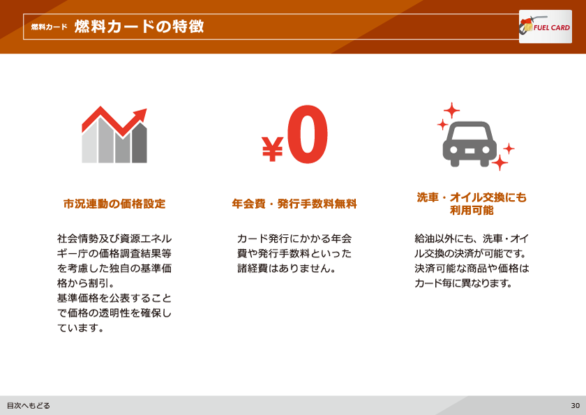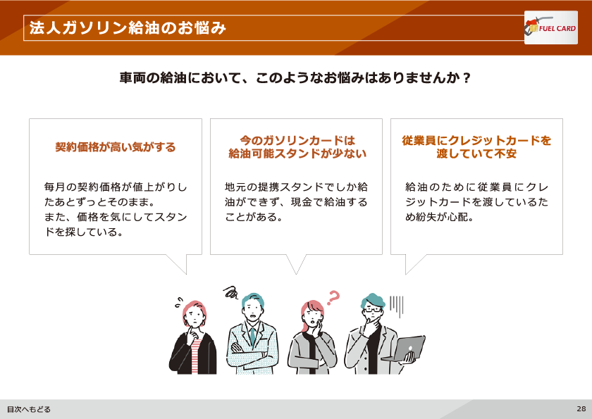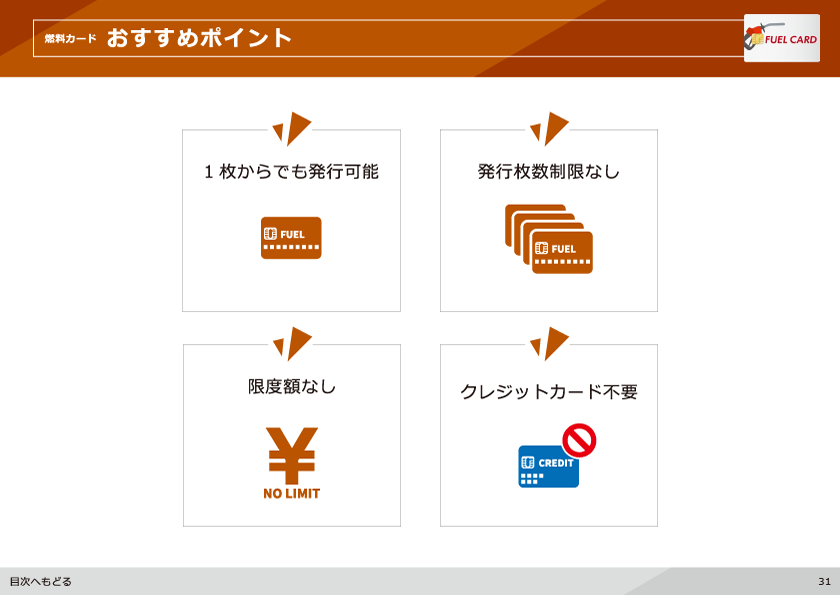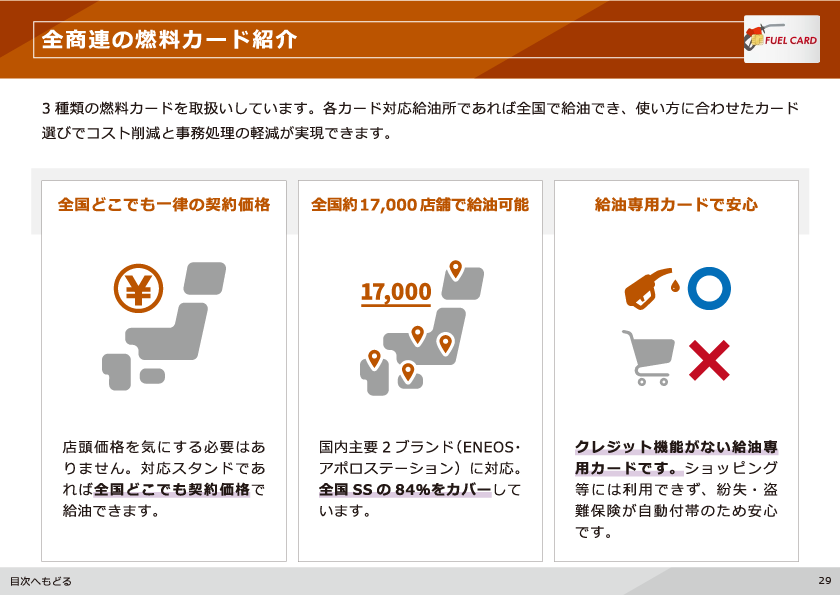 全商連加盟組合で取り扱っている法人向けのガソリンカードの詳細を分かり易くご案内しています。給油価格の設定からご利用できるサービス、ガソリンカード別の対応給油店舗数や付帯保険の内容などもご覧いただけます。お近くの店舗やよく通る道路でのブランドに合わせてご検討ください。