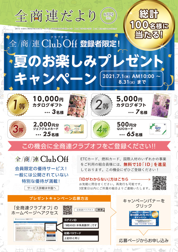 組合員様に現在のいちおし商材や全商連の活動状況、知っておいて損のない情報等を掲載しており、読み応えも十分な内容になっております。 ご興味の頂いた内容につきましては、全商連・各加盟組合に遠慮なくお電話ください。